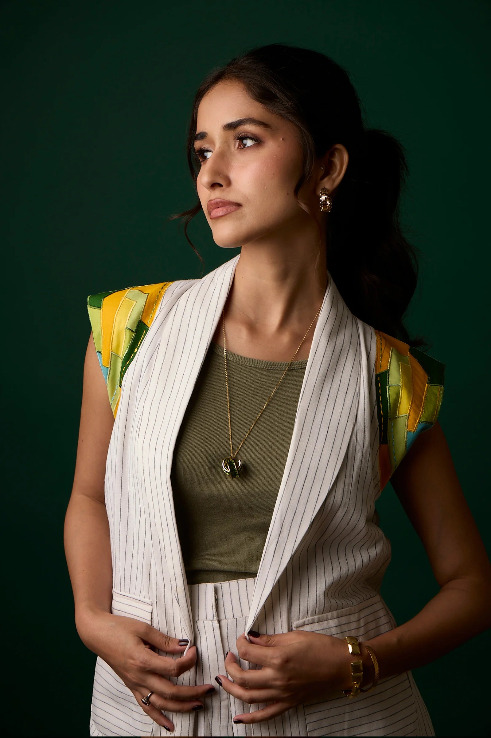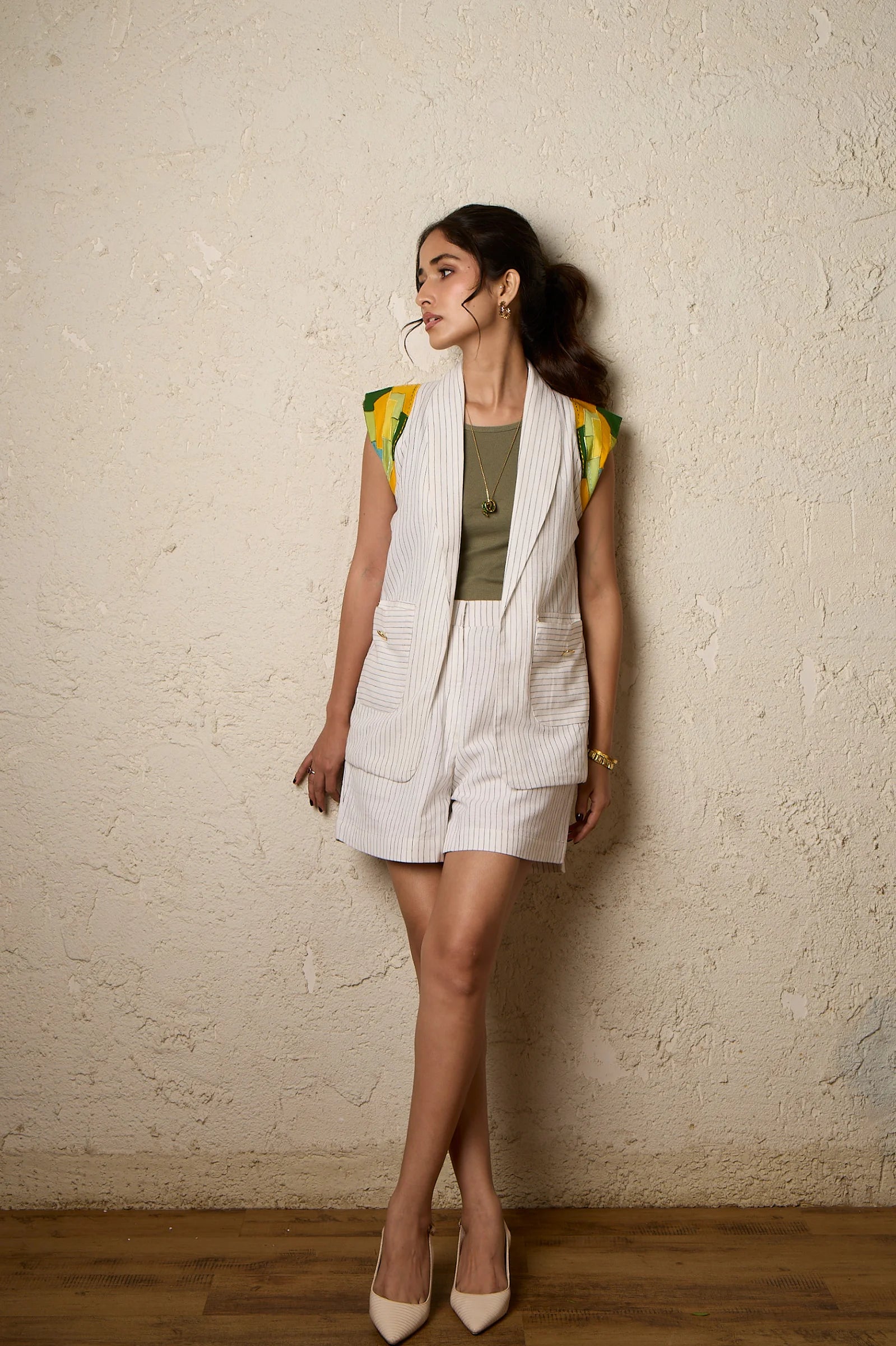 Crafted in fine handloom cotton, this art-inspired apparel, features an off-white striped open blazer and baggy shorts combo that pairs casual ease with elegant details. The bold applique on the sleeves adds a unique print, making this look as unforgettable as you are.